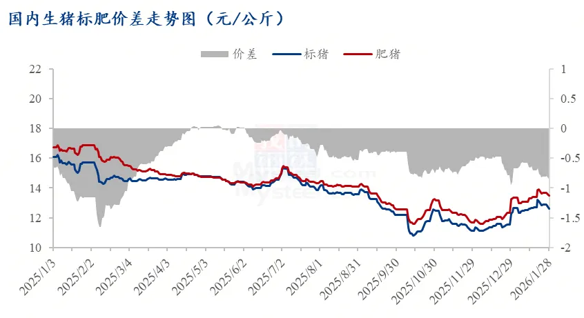 近期生猪标肥差呈现持续走扩态势,核心驱动因素是标猪价格降幅显著大于大猪价格降幅。背后逻辑在于,前期标猪供应相对充裕,而市场对中大猪的刚需支撑较强,叠加中小散压栏惜售减少大猪市场供应,导致大猪价格表现坚挺,标猪价格受供应压力影响降幅更大,进而推动标肥差持续走扩。标肥差的走扩进一步强化了养殖端压栏养大猪的意愿,同时也为二次育肥进场提供了支撑,后续需持续关注标肥差走势对市场供给结构的影响。