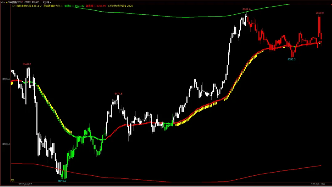下图是本周二的1分钟走势图,早上开盘是绿色涨跌色带+黄色色带是加速下跌,下午是红色涨跌色带+黄色色带是加速上涨;