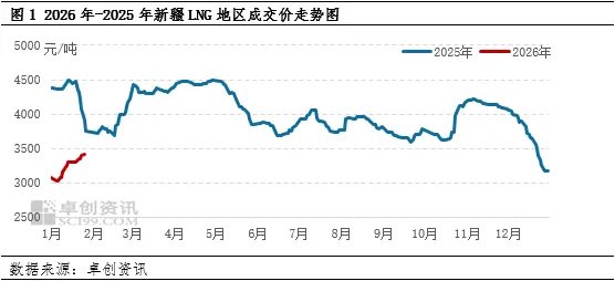 具体来看,纵观1月,月初市场看跌情绪浓厚,需求不及预期叠加元旦假期影响,价格小幅下探至全月低位,供应缩减所带来的提振效果被假期因素对冲,市场以止跌维稳为主;月中供应端持续减产带动库存缓慢削减,叠加疆内产销平衡逐步达成,市场信心回暖,价格稳步上行并进入短暂企稳状态;月末供应进一步收缩,北疆需求边际改善,叠加国内LNG市场整体上行氛围带动,价格突破前期企稳区间,小幅提速上行。