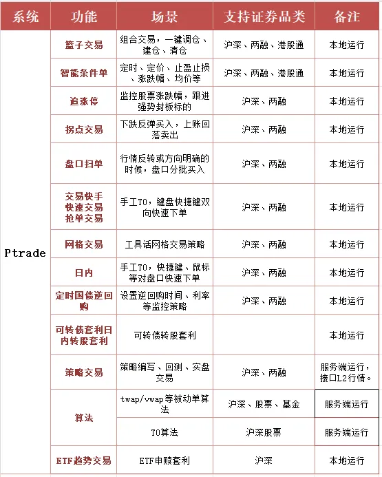 PTrade拥有丰富的个性化交易工具支持智能算法,特色工具:ETF趋势交易、策略交易、网格交易、篮子交易、追涨停、抢单交易、盘口扫单等,条件单:支持价格埋单、时间埋单、止盈止损埋单、拐点交易等。以智能条件单工具为主,可对标东方财富、通达信、同花顺收费版,较容易上手。