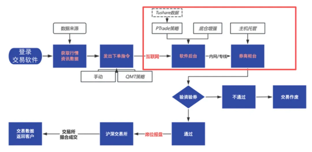 与传统方式(策略在本地运行,指令需经网络传输至券商服务器)不同,PTrade 将用户策略直接部署在券商云端服务器上运行。这意味着交易指令的生成点与最终执行点处于同一物理/网络环境,省去了从用户终端到券商后台的完整传输链路。