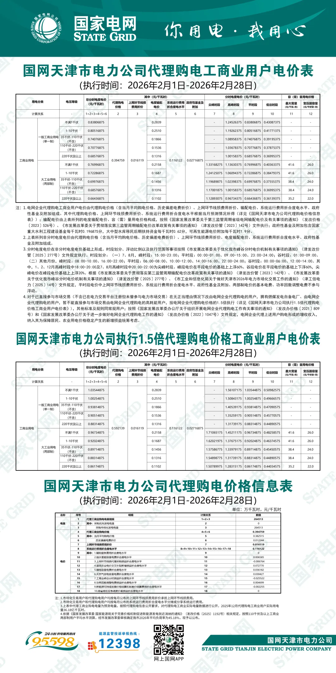 天津市2026年2月电网代理购电价格