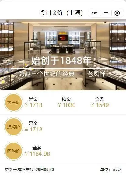 老凤祥上海会员中心小程序发布数据显示,足金饰品报1713元/克,单日上涨93元/克。