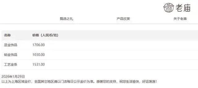 老庙黄金官网发布数据显示,足金饰品报1706元/克,单日上涨94元。