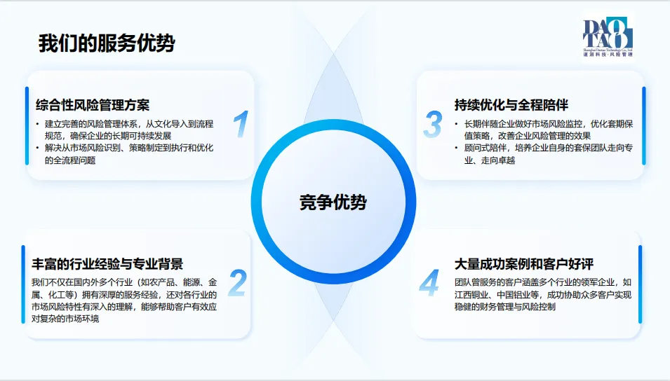 4. 提升企业团队能力:专家不仅提供咨询服务,还会为企业提供培训,提升团队的风险管理和套期保值执行力,使企业能够独立应对市场挑战。