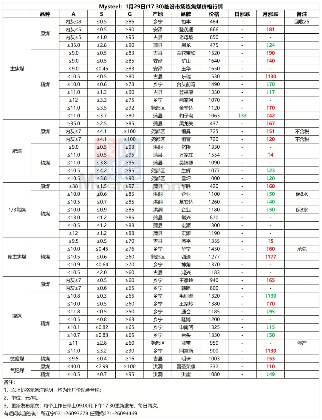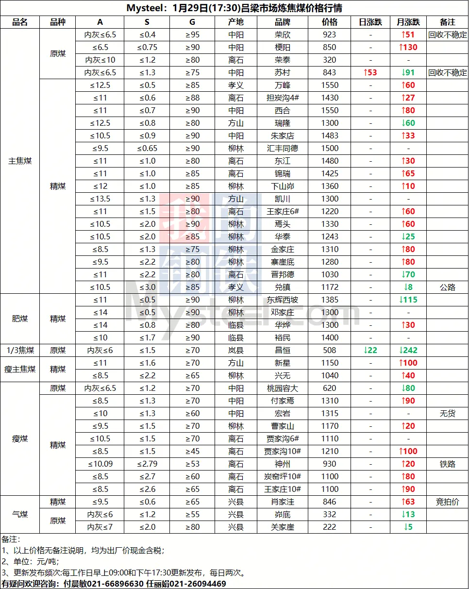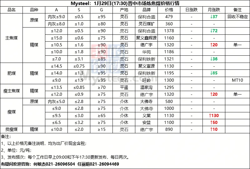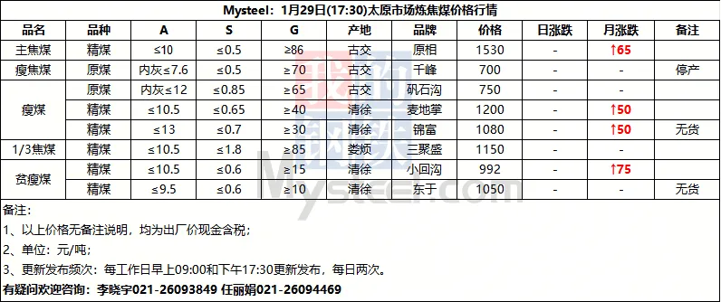 29日国内市场炼焦煤价格弱稳运行。供应方面,本周统计523样本煤矿原煤日产环比减少1.6万吨,产量小幅下降。后期随着春节临近,停产放假煤矿将逐渐增加,炼焦煤产量有望持续下降。目前煤矿新签订单情况一般,但由于前期预售订单较多,多数矿点仍以执行旧单为主,报价暂时保持稳定;部分高价资源销售不畅,价格承压回落。其中,临汾安泽市场炼焦煤价格下跌10元/吨,低硫主焦精煤(A9、S0.5、V20、G85)出厂价现金含税报1630元/吨。需求方面,焦炭将于明日第一轮提涨落地,对炼焦煤有一定支撑,但目前焦煤冬储补库进入收尾阶段,下游整体采购需求有所减弱。综合来看,预计短期炼焦煤价格将弱稳运行。