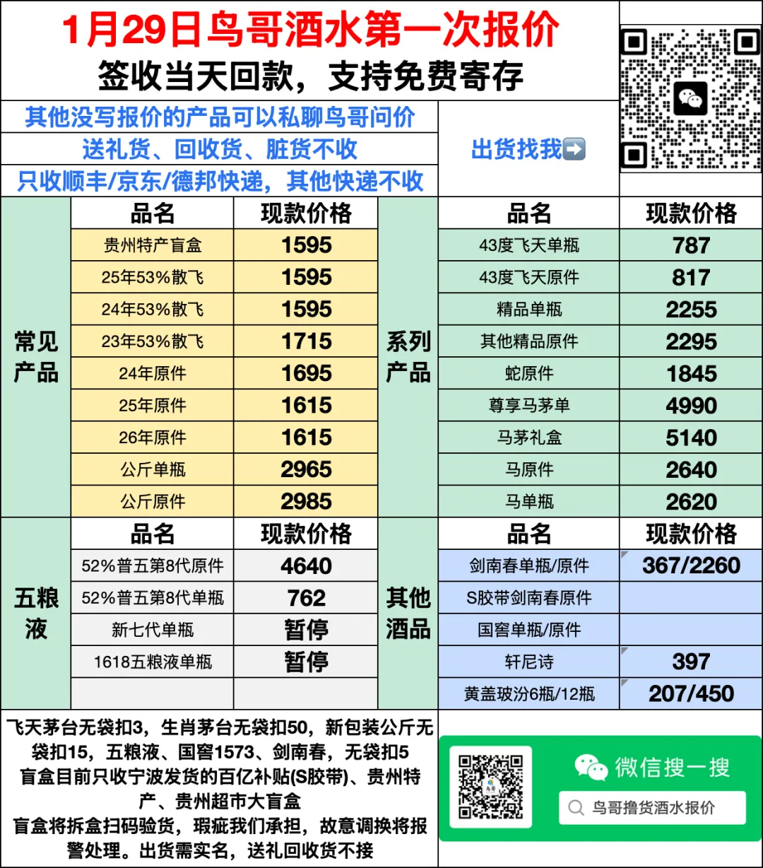 | 寄件地址:鸟哥收货小程序复制地址:回款收款:宁波地址签收后私信鸟哥报单:单号+明细到货默认出货,要寄存请提前通知!例如: SF6688548664364+ 飞天茅台盲盒双瓶*8+八代五粮液*6+出库/寄存 签收验货现款秒款 |