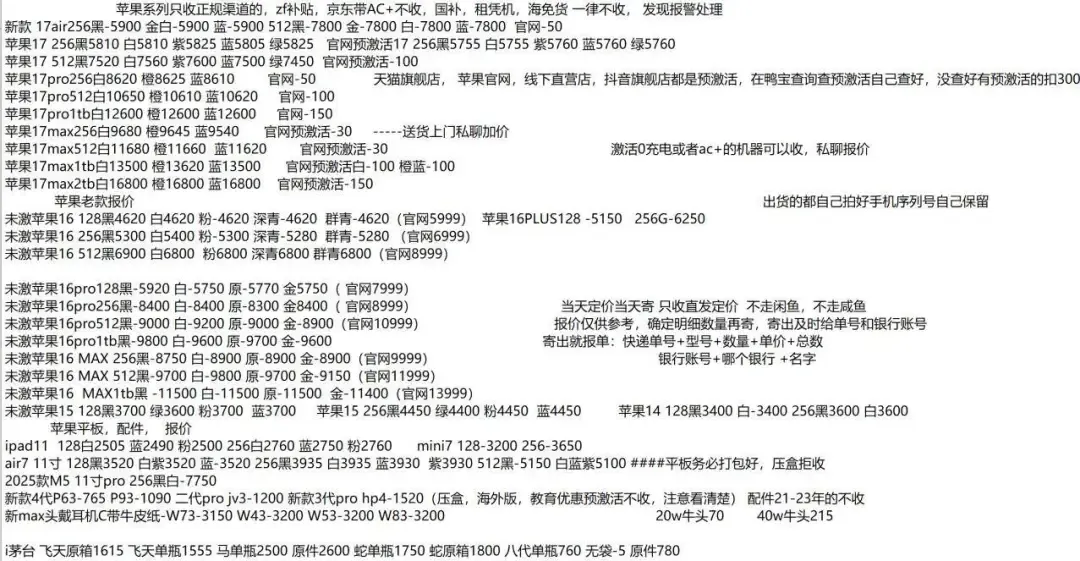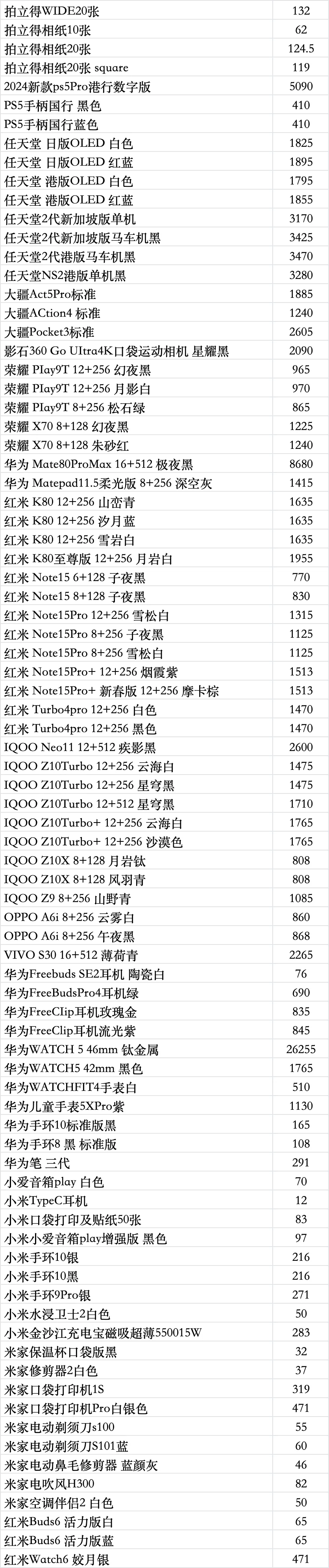 任天堂游戏机: 新款二代NS2日版单机&同捆:2440 新款二代NS2港版标配机:3250 新款二代NS2港版马车机:3440,没游戏码:3190(注意下单要看有没有游戏码的 要不然就是便宜的) 新款二代NS2新加坡版 台版 单机:3150,就是没有游戏的 新款二代NS2欧版 美版 单机:3150,就是没有游戏的 新款二代NS2韩版 单机:3120,就是没有游戏的 新款二代NS2新加坡版同捆:3420 NS2港版宝可梦同捆:3560 OLED屏 日版白-1825 彩色-1915 OLED屏 港版白-1795 彩色-1855 OLED屏 国行白-1595 彩色-1595 OLED屏 朱紫港版-1895 日版-1895 OLED屏 喷射港版-1895 日版-1895 健身环国行-145 海外版-340 LITE日版 港版 蓝:1030,黑粉1030,绿黄1030 注意区分,这些就不是oled屏的 价格以下(续航版) NS续航国彩-1420 黑-1300,拆封-50 NS港彩续航- 长款- NS续航日彩-1500 黑-1430 长款-50 索尼PS5游戏机 (PS5都要留好纸箱带来,以免破坏品相) 2024新款:PS5 PRO日数:4710 2024新款:PS5 PRO港数:5090 2025新款:PS5 PRO国数:4610 2023新款ps5 日版光驱Slim:3150 2023新款ps5 日版数字Slim:2700 2023新款ps5 国行光驱Slim:老款:2890,新款2920 2023新款ps5 国行数字Slim:2270 2023新款ps5 港版光驱Slim:3180 2023新款ps5 港版数字Slim:2700 PS5国行手柄:黑白410,其他410,外版-20 只收跨境 PSP串流机:1345白,1345黑 PS5单光驱:615,外版595 ROG XBOX : OLED SteamDeck掌机掌上游戏机 512G 美:3960,日港:3960 OLED SteamDeck掌机掌上游戏机 1TB 美:4530,日港:4530 大疆3标准:,全能: 大疆Action4标准:,全能: 大疆ACT5 Pro标准:,全能: 大疆action5pro畅拍: 大疆AC6标准: 大疆AC6畅拍: 大疆NEO标配:,全能: 大疆OM7P:,om7: 大疆 mic1拖1:,1拖2: o4图传: 拍立得MINI12影像花室套装:,外版,一次成像礼盒装 拍立得SE国行:,白色: 拍立得相纸20张:124.5,10张:61.5 拍立得锡纸装10张:60 任天堂 手柄 NS左右手柄:385 NS2左右手柄:430 NS2 PRO 黑柄:420 PRO国黑柄:305,外版280只收跨境 PRO乱斗柄:320只收跨境 PRO王泪柄:340只收跨境 PRO喷射柄:340只收跨境 PRO异度柄:340只收跨境 华为手表价格更改 下调 GT5 46m 灰915 FiT3 黑430白430粉430 2026年1月29日 华为配件全系列 行情参考 以结算价为准 所有货都不收国补的,一经发现就当送我们的 华为Watch FIT系列 Watch FiT4:黑520、白505、绿520、紫520、银575 Watch FIT4 pro:黑1125、蓝1105、绿1175 WATCH FIT 2活力款:黑色335、粉330 WATCH FIT 3:黑445、灰475、月光白445、原野绿455、粉445、薄荷绿455、蓝455、珍珠白495 华为Watch D2系列 Watch D2:黑2745、白2665、蓝2665 Watch D2 药房版:2445 华为其他经典手表 Watch buds:黑1135、卡其色1205 GT4 41mm:白795、黑695、草木绿-5 GT4 46mm:黑905、棕-5、绿-5 Watch 4:黑-5、褐-5、白-5 Watch 4pro:棕-5、火星钢-5、蓝-5、太空探索-5 Watch 5 46mm:黑1825、紫2175、棕2280、蓝1865、钛空银2625 Watch 5 42mm:黑1755、白1835、杏2235、绿1765、金2355 非凡2:黑5175、蓝6175 非凡手表:黑3375、蓝-5、绿-5 华为GT5/GT6系列 GT5 46mm:黑1115、蓝930、棕915、灰925 GT5 41mm:黑945、蓝885、白915、青860、棕845 GT5pro:黑1195、陶瓷2095、钛钢色1405、冰川白1005 GT6 pro:黑1850、棕2045、钢2495 GT6 46mm:黑1180、灰色1275、绿色1395 GT6 41mm:黑1105、棕色1375、白色1270、紫色1095 华为儿童手表系列 儿童4pro:蓝475、粉480 儿童5pro:蓝735、粉725、绿740、紫735 儿童5X:蓝775、粉775 儿童5Xpro:黑1120、紫1130 儿童5:绿350、紫350、蓝405、活力蓝350、红345 儿童5星耀:粉405、蓝415 荣耀手环,华为手环系列 手环9标准:黑90、蓝100、紫100 手环9NFC:黑115、蓝115、紫115 手环10标准:黑127、绿133、灰133、蓝133 手环10NFC:黑155、灰155、绿155、蓝150 华为手环 手环8标准:黑105、粉108 手环8NFC:黑110 手环9:黑155、白145、粉143、黄140、蓝140 手环9nfc版:黑160、白150、粉150、蓝150、黄150 手环10标准:黑162、粉162 手环10铝合金款:黑169、白170、蓝170、紫173、向新绿158、原野绿158、灰160 手环10NFC:黑198、白200、蓝195、紫200、绿195 华为B7 B7:黑700、灰725 华为耳机系列 Free Arc:绿405、灰415、黑415 FreeBuds 7i:白335、灰333、粉335 freebuds6i:白270、黑273、紫280 Free clip2:黑1165、白1165、蓝1160 Free clip:黑色835、暖星云915、紫845、玫瑰金835 FreeBuds 5i:黑225、白217、蓝215 FreeBuds se2:白73、蓝73、黑73、紫74 FreeBuds se3:黑103、金103、白100 FreeBuds Se4:白155、黑153 FreeBuds 6:白540、黑545、紫540、金535 FreeBuds 4e 2024款:白285、银285 FreeBuds pro5:白1160、银1180、金1180 FreeBuds pro4:黑695、绿690、白720 华为手写笔&配件 CD56 pro笔:450 CD54S 三代笔:288 三代笔充电器:78 Wifi5:黑175、白175、青173 WiFi3 pro:265 AX3:114 AX6 new:225 AX3 pro new:197 AX3 pro WiFi7:187 BE3pro 千兆版:180 BE3pro 疾风版:167 BE7pro:390 AX2pro:98 Q6 一拖一凌宵版:465 荣耀手表系列 手表4pro:黑745、棕845、绿845 手表5pro 蓝牙版:黑1105、灰1105 手表5pro 插卡版:黑1205、灰1205 手表5Ultra:黑1215、棕1445、钛金属1895 手表5:黑525、金525 华为移动电源 22.5w se:黑85、白90 66w:白180、蓝185 CP11QC:83 |