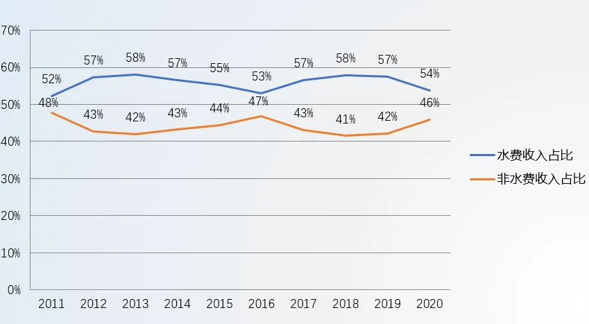 从供水企业水费收入及非水费收入占总收入情况可以看到,四川省2011-2020年以来供水企业水费收入占总收入的52%-58%,非水费收入占总收入的42%-48%。