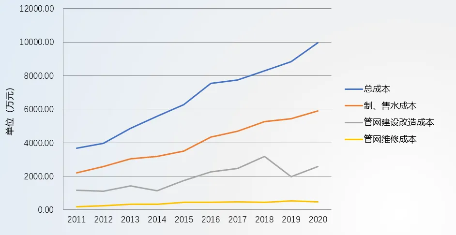 分析供水企业2011-2020年成本变化情况,2011-2020年以来总成本、售水和制水成本、管网维修成本以及管网建设改造成本都呈现不断上升的趋势。
