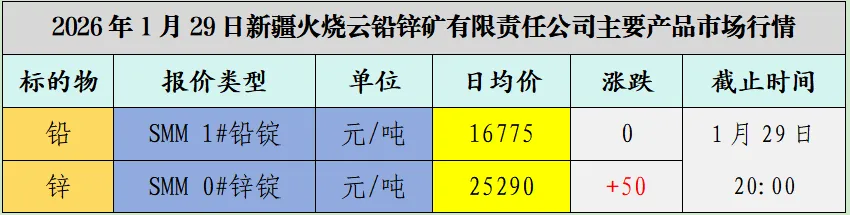 >今日行情 | 2026年1月29日新疆火烧云铅锌矿有限责任公司主要产品市场