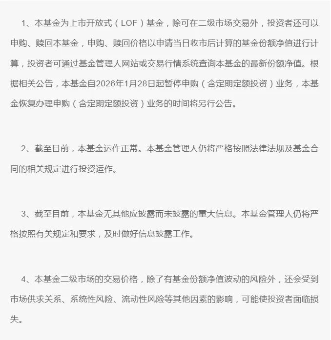 境内唯一主打白银期货投资的基金——国投白银LOF公告,本基金将于2026年1月30日开市起停牌至收市。若本基金2026年2月2日二级市场交易价格溢价幅度未有效回落,本基金有权通过向深圳证券交易所申请盘中临时停牌、延长停牌时间等措施,向市场警示风险,具体以届时公告为准。