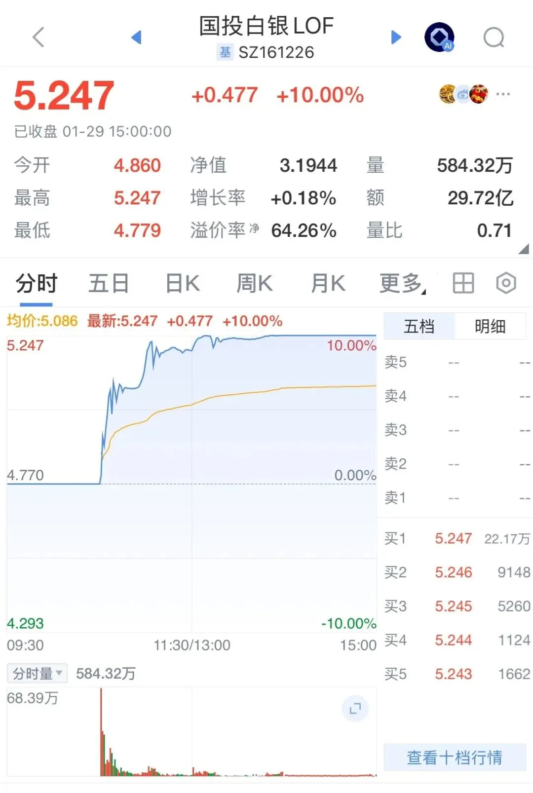 1月29日,国投白银LOF(161226.SZ)再度封死涨停,场内价格报5.247元/股,单日成交额逾28亿元,实现停止申购后的连续两日涨停,目前基金的溢价率高达64.26%,创下近期新高。