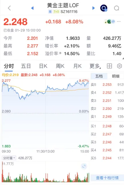 根据易方达黄金主题LOF最新披露的净值,1月27日该基金净值为1.9633元/份,二级市场价格相比之下溢价14.5%。
