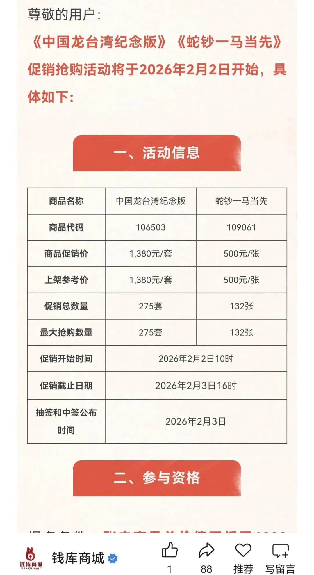 ❶发布关于《中国龙台湾纪念版》《蛇钞一马当先》原始票抢购公告,将于2026年2月2日开始。