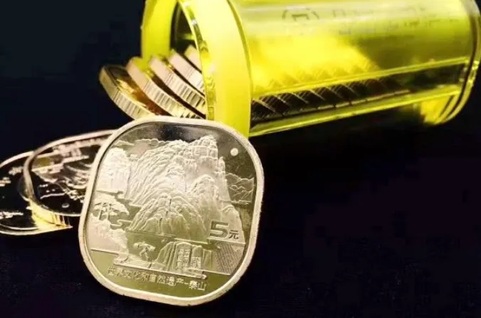 泰山币的正面图案是国徽和"中华人民共和国"字样,背面主图则是巍峨壮观的泰山景象,整体呈现金黄色调,相当漂亮。