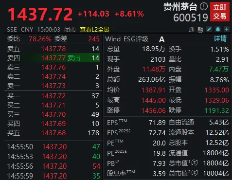 29日,A股白酒板块集体爆发,多股涨停。第一权重股贵州茅台放量大涨8.61%,报1437.72元/股。网友纷纷表示:“这是我的茅台么?”“能到1400以上真是想不到”“茅台今天变成黄金股了”