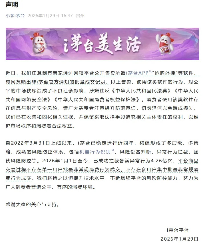 贵州茅台酒股份有限公司下属公众号“小茅i茅台”1月29日发布声明:近日,我们注意到有商家通过网络平台公开售卖所谓i茅台APP“抢购外挂”等软件,有网友晒出非i茅台官方通知的批量成交记录。以上售卖、使用该类软件的行为,对公平的市场秩序造成了不良社会影响,涉嫌违反《中华人民共和国民法典》《中华人民共和国网络安全法》《中华人民共和国消费者权益保护法》。消费者使用该类软件存在信息与财产安全风险,请广大消费者注意提升防范意识,切勿轻信以免造成损失。我们已在收集和固化相关证据,并保留采取法律手段追究相关主体责任的权利,以维护市场秩序和消费者合法权益。自2022年3月31日上线以来,i茅台已稳定运行近四年,构建形成了多层级、多策略、成熟的风险防控体系,包括机器行为识别、风险设备判断、异常行为拦截、团伙风险防控等。2026年1月1日至今,已成功拦截各类异常行为4.26亿次,平台商品交易过程不存在单一用户批量非常规消费行为成交,不存在多用户集中批量非常规消费行为成交。我们将持之以恒提升技术水平,不断增强平台的风险防控能力,努力为广大消费者营造公平、有序的消费环境。来源:中国基金报、上海证券报、新闻坊、“i茅台平台”、FM93浙江交通之声安徽交通广播新年福利季