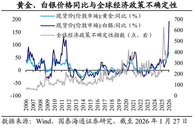 对标黄金:白银属性有何不同?回看历史,金、银价格的涨跌同步,但白银价格更具波动性。第一,白银的商品属性远强黄金,工业需求更为广泛。第二,白银的货币属性历史悠久但已显著弱化,且避险属性远不及黄金。在发生系统性风险、通胀高企、货币信用危机时,白银价格跟随黄金上涨,一旦危机缓解,该属性会迅速让位于商品属性。第三,白银的金融属性驱使价格更具弹性。由于单价低、波动大,白银容易吸引大量短线投机者和动量交易者,价格可能因投机炒作出现暴涨暴跌。