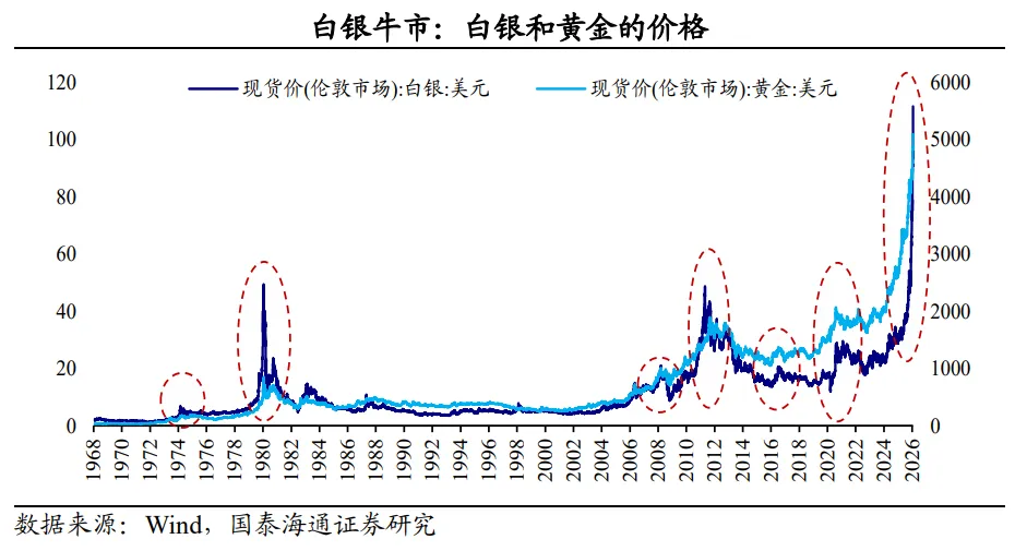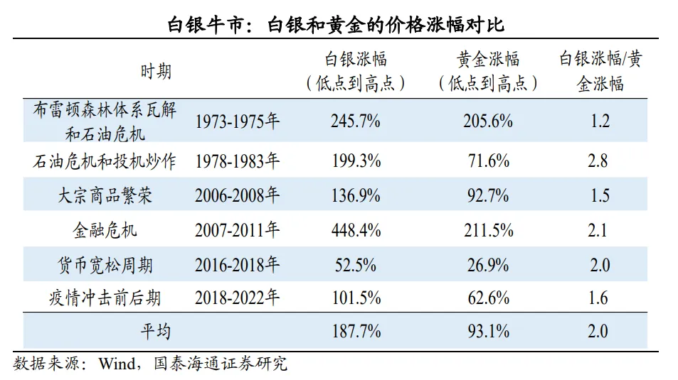 进一步,我们统计了数次白银牛市行情下的金银价格表现,平均来看,银价涨幅与金价涨幅的比值在1.2~2.8的范围区间。在本轮行情中,仅从2026年以来,这一比值已经达到2.8。
