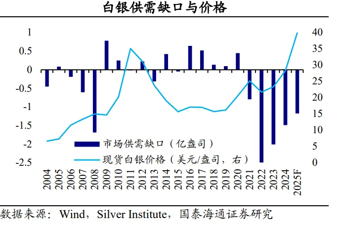 银价飙升:“工业和金融”需求共振。在中长期,白银的价格由商品属性主导,不过其供给弹性小,工业需求是核心。长期以来,白银价格与全球工业景气周期密切相关。当经济繁荣、工业生产扩张时,用银需求增加会提振银价。反之,用银需求萎缩会压制银价。过去几年,以光伏、新能源汽车、AI服务器为代表的新兴产业,创造了结构性的、持续增长的白银需求。全球白银供需的缺口在2020年显现,并持续到2025年,支撑银价上涨。