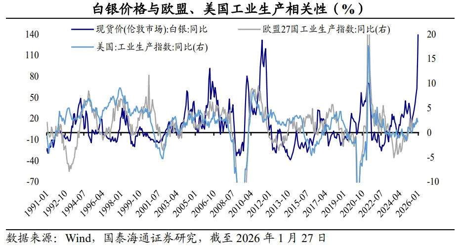 长期以来,白银价格与全球工业景气周期密切相关。当经济繁荣、工业生产扩张时,用银需求增加会提振银价。反之,用银需求萎缩会压制银价。2025年下半年以来,欧盟、美国的工业生产稳步回升,对白银价格有所提振。更值得关注的是,过去几年,全球能源转型加快,对白银需求形成稳定支撑。比如,世界白银协会数据显示,2025年全球光伏用银量预计达到1.96亿盎司,是2021年的2.2倍。全球白银供需的缺口在2020年显现,并持续到2025年,支撑银价上涨。