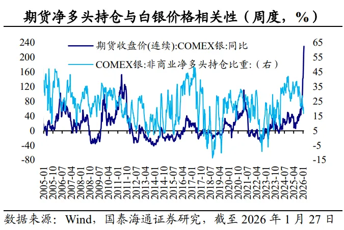 第三,白银的金融市场规模小于黄金,其金融属性驱使价格更具弹性。在现代金融市场,金、银投资手段丰富,均拥有ETF、期货、期权等衍生工具,但是白银投资的波动性更大、投机性更强。一方面,白银市场的价值规模远低于黄金,流动性相对较差。这使得少量资金就能对白银价格产生巨大冲击。另一方面,由于单价低、波动大,白银容易吸引大量短线投机者和动量交易者。这使得白银对市场风险偏好、投机资金流向较为敏感。当流动性泛滥时,白银价格可能因投机炒作出现暴涨暴跌。