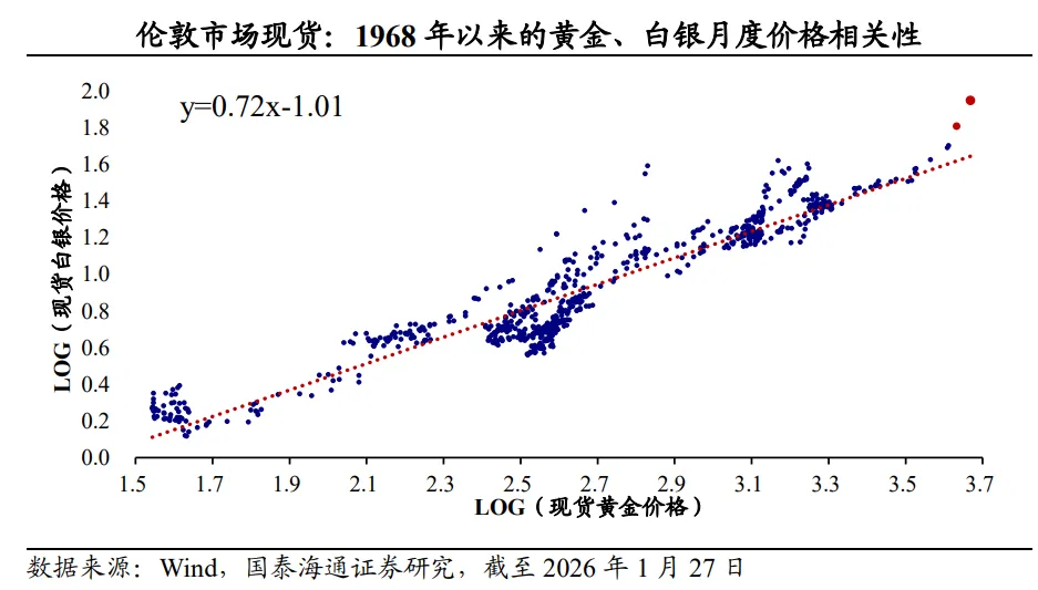 银价波动与金价高度相关,且弹性更高。回看历史,黄金、白银既是商品,又是货币,且都具备金融投资、避险属性,但是权重和表现方式有显著不同。所以,金、银价格的涨跌近乎同步,但白银价格更具波动性和复杂性。在黄金价格飙升、狂跌的时期,金银比往往反向运行,体现出白银价格弹性更大。