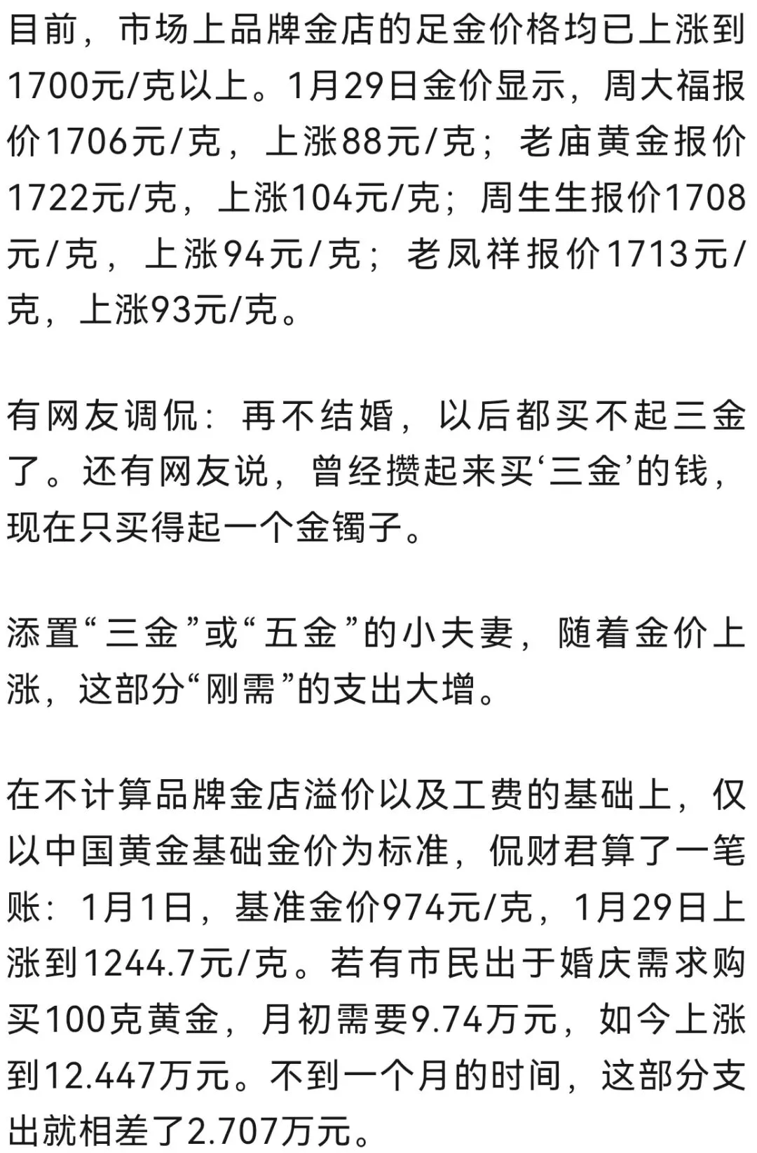 “金价涨太‘狠’了,下不去手啊。”1月29日,王府井周大福专柜,陶女士看着标价签叹了口气。