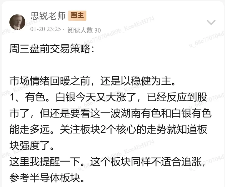 今天沪指、深成指冲高回落,创业板指高开低走,盘中一度跌超1%。全市场超3600只个股下跌。沪深两市成交额2.97万亿,较上一个交易日放量704亿。从板块来看,资源股全天领涨,贵金属、油气、电解铝方向轮番爆发,中国黄金4连板,湖南黄金3连板,中曼石油、晓程科技3天2板,四川黄金10天6板,招金黄金8天5板,石化油服、准油股份涨停,中国铝业涨停创16年新高。分散染料概念集体走高,浙江龙盛、闰土股份、亚邦股份涨停。存储芯片概念表现活跃,中微半导触及20CM涨停,气派科技20CM涨停。下跌方面,医药医疗、光伏等板块跌幅居前。这两天大盘指数这么能抗,最重要的原因是黄金有色和石油涨的好,这些是指数的权重板块。今天有色涨的特别很厉害,思锐老师看了一下,全网都在铺天盖地的说黄金,说白银。先是贵金属(黄金,白银等),然后是石油化工,最后到农业。今天基本是继续全线上涨,金属,化工,石油,包括农业都开始动了。这算一个小高潮了!不过话说回来,如果前期没有布局,就不要贸然去追涨,特别是黄金白银。尽量等调整后再看承接去做决策。当全网都疯狂的时候,往往就是兑现的时候。从交易层面来看,太一致的板块,第二天是不能轻易去接力的。这里思锐老师不是看空,主要给大家强调一下追涨的风险,想要参与要把握好节奏。哪怕我前面最低点的时候就分享过有色的涨价逻辑,也讲到过市场最强的两只股票,但这里我也不会再考虑分享了。今天稀缺金属再度高潮,除去金银铜外,其余的有色稀有金属,都有强势表现,大主线无疑,但高位面临的监G压力不小,多看低位的,高位大概率是会延续震荡走强,低位补涨的趋势。航天和AI等辨识度个股均有不同程度调整,但局部先锋开始企稳走线,西部材料,再升科技,巨力索具留下一丝反攻火苗,尾盘航天也有资金抢筹,但热点已不在,后续更多还是震荡走势,多看抗跌的个股,缩容炒作还是有局部机会。逻辑上,科技和涨价的轮动还会继续下去,但目前涨价确实要强过科技。不过科技的基本面没有问题,机器人板块,预期没有任何改变。这块耐心等止跌轮动。近两年的行情,操作上越来越难,对散户更是如此,交易节奏非常关键,市场走到哪个阶段,该怎么应对,都要不断总结。长期坚持下来,就会越来越有信心,亏了也知道怎么挣回来,大起大落情况越来越少,这样正反馈的效果越来越多。下个月马上就来了,市场将越来越明朗。无论是天气明媚,还是阴云密布,思锐老师都会陪伴大家左右。2026年2月VIP会员招生已经开始,想要报名进VIP会员群的同学记得联系我,报名截止到1月31日晚24点,然后非常感谢同学们一直以来的支持,我们2月份VIP群见!