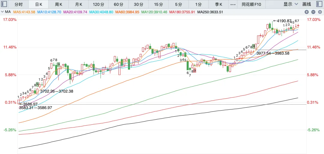 昨天晚上讲了两个重要点,一是提醒贵金属和有色金属的风险,二是要关注4180点附近阻力,如果行情开始接近4180点,预计会出现急跌或者回落行情。