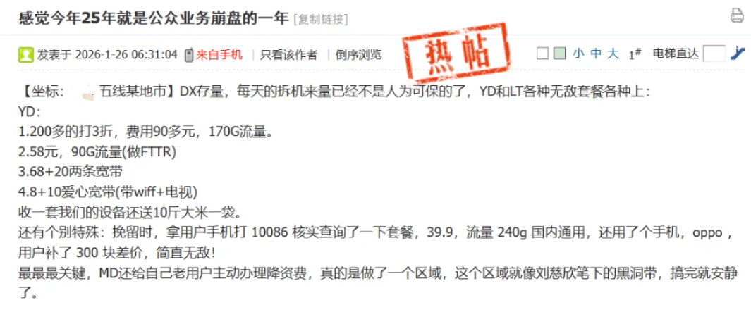据网友爆料:XX省五线某地市,DX存量,每天的拆机来量已经不是人为可保的了,YD各种无敌套餐各种上:YD:1.200多的打3折,费用90多元,170G流量。2.58元,90G流量(做FTTR)3.68+20两条宽带4.8+10爱心宽带(带wiff+电视)收一套我们的设备还送10斤大米一袋。还有个别特殊:挽留时,拿用户手机打 10086 核实查询了一下套餐,39.9,流量240g国内通用,还用了个手机,oppo ,用户补了300块差价,简直无敌!最最最关键,MD还给自己老用户主动办理降资费,真的是做了一个区域,这个区域就像刘慈欣笔下的黑洞带,搞完就安静了。