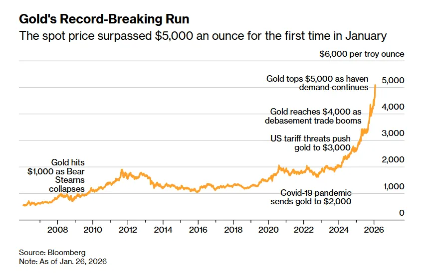 这些因素促使这种贵金属接连创下价格新高,并超越了其经通胀调整后的1980年峰值。1月下旬,黄金价格首次突破每金衡盎司5000美元大关。