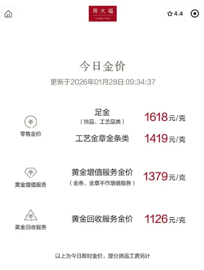 国内黄金饰品价格对比显示,多家黄金珠宝品牌当日公布的境内足金首饰价格大幅上调,周生生报价1614元/克,周大福报价1618元/克,老凤祥报价1620元/克,老庙黄金报价1612元/克。