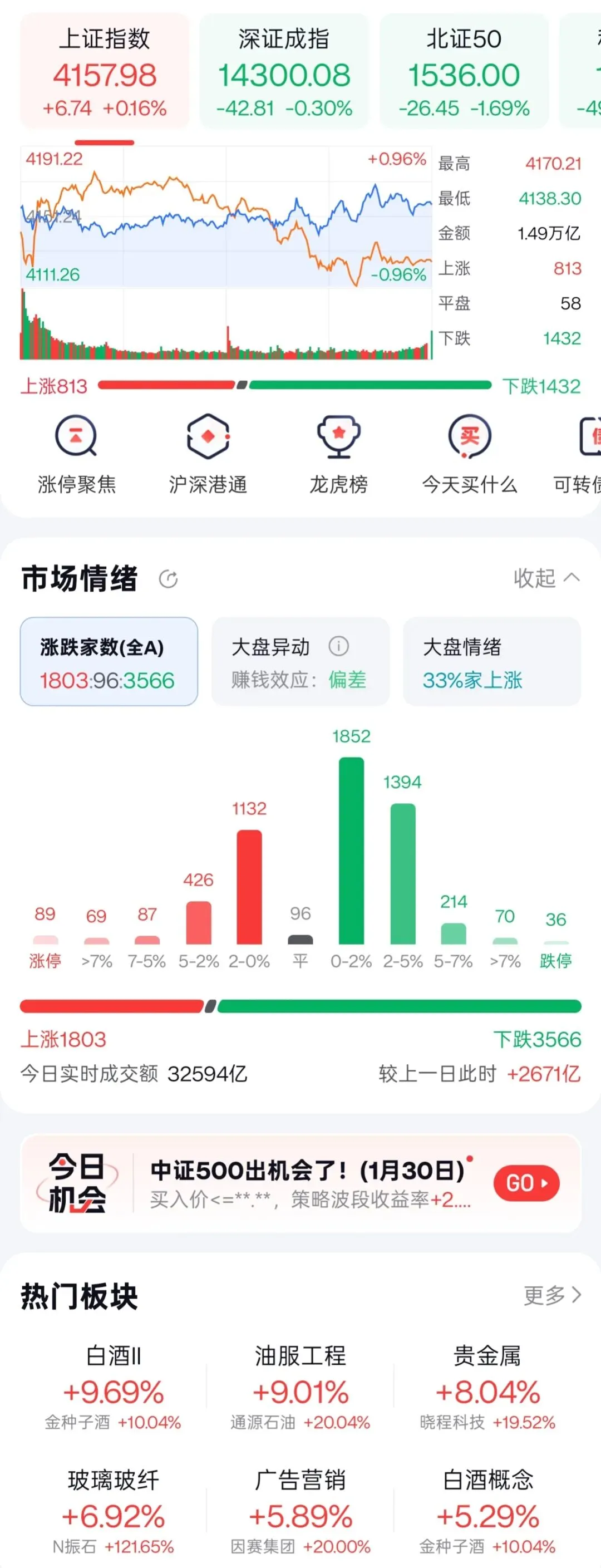 今日A股"极致分化":权重蓝筹(白酒、贵金属、金融)强势领涨,其它板块半死不活: