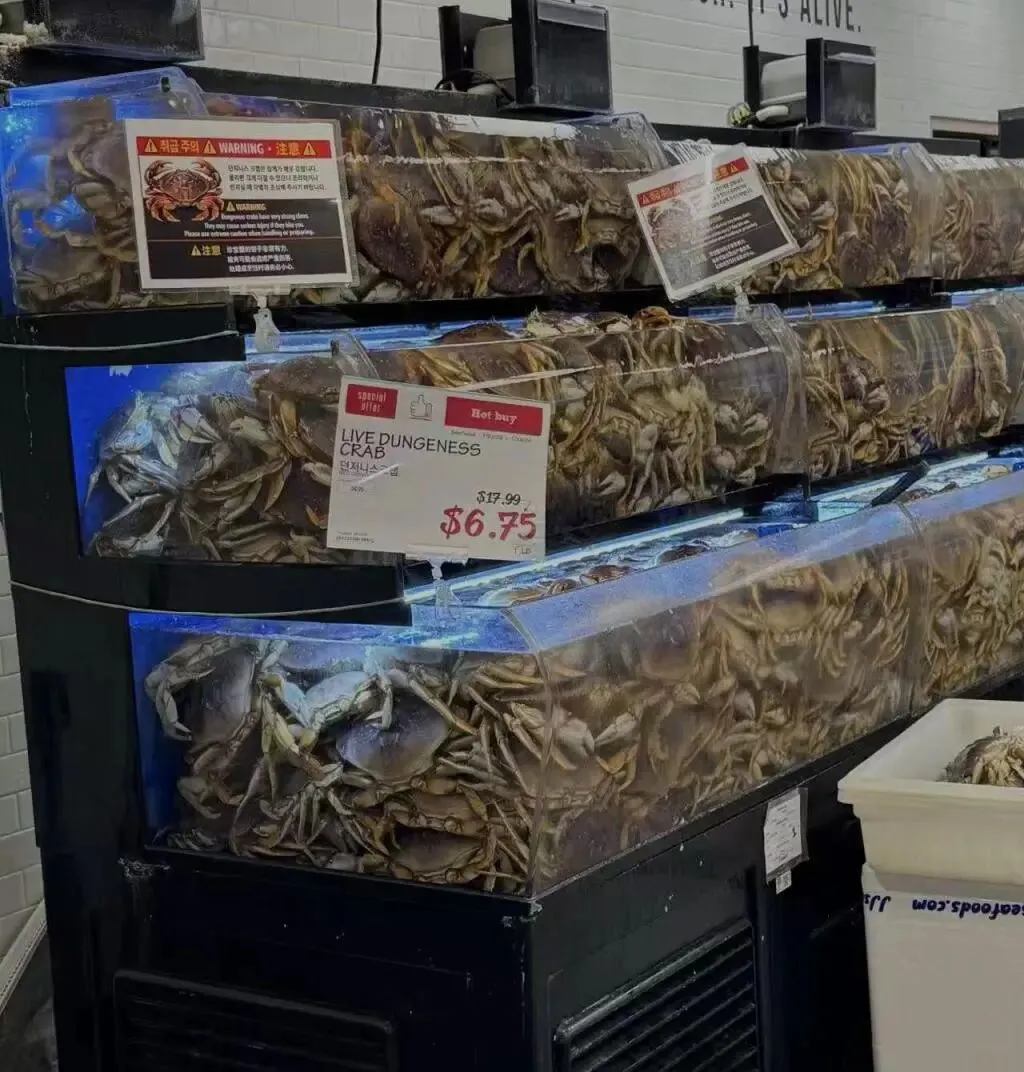 记者近日走访多家南加华人超市可见,水槽中的珍宝蟹经常在上午补货后不久便被抢购一空。以大华超市为例,珍宝蟹标价每磅7.99美元,工作人员表示,货量几乎每天中午前就会售罄,「下午来基本买不到」。而在部分韩系超市,如H Mart,珍宝蟹甚至标出每磅6.75美元的促销价,价格一出随即引发排队抢购,场面热烈。