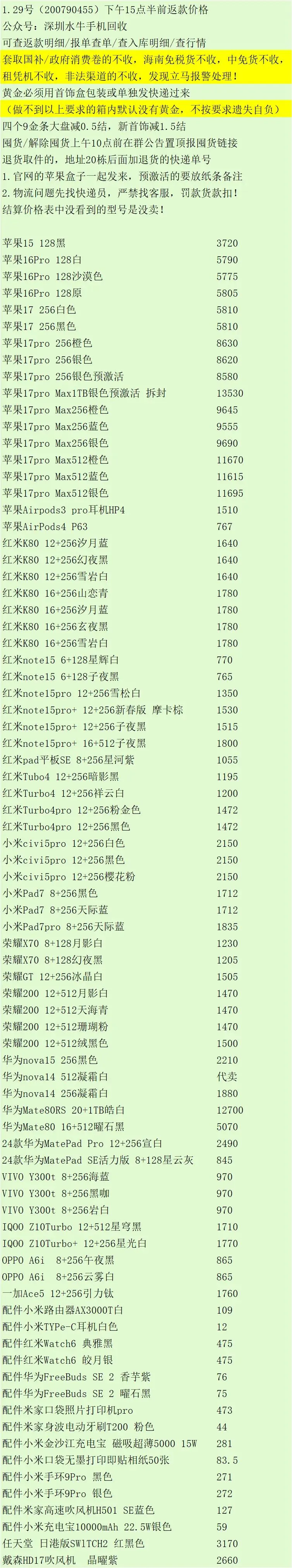 返款价格上面没有的型号颜色也收,当天有到的才有出结算价格。