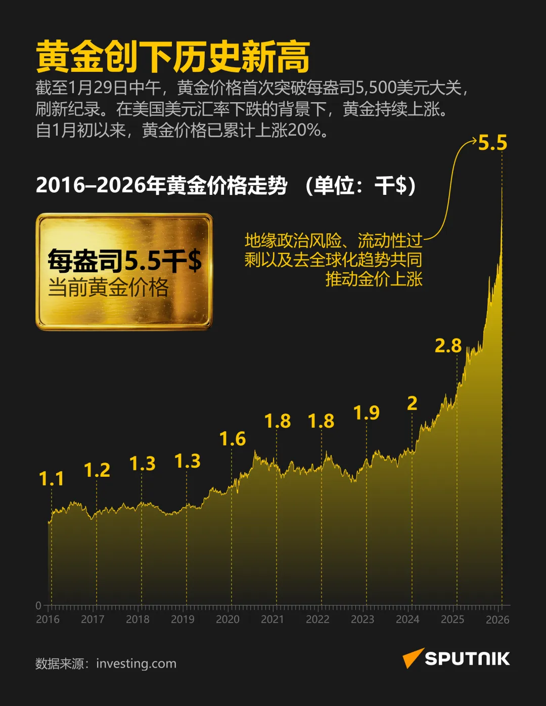 1月29日午间,黄金价格创下历史新高——首次突破每盎司5500美元。金价上涨的背景是美元汇率走低。自1月初以来,黄金价格已累计上涨20%。更多细节详见卫星通讯社信息图表。截至北京时间0时25分,黄金现货价格为每盎司5256.24美元。