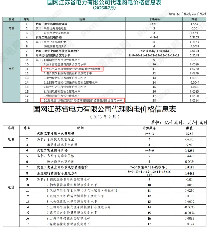 系统运行费用:2026年2月江苏系统运行费用折合度电0.1248元/千瓦时,比2025年0.0483元/千瓦时高出近2.6倍。这一变化主要因将新能源可持续发展价格结算机制差价结算费用折合度电水平、天然气发电容量电费(2026年江苏容量电价提至165元/千瓦·年)等纳入系统运行费用。