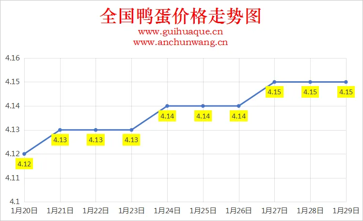 2026年1月30日全国鸭蛋价格行情快递:稳定为主,个别地区蛋价上涨,今日全国鸭蛋均价4.16元/斤。