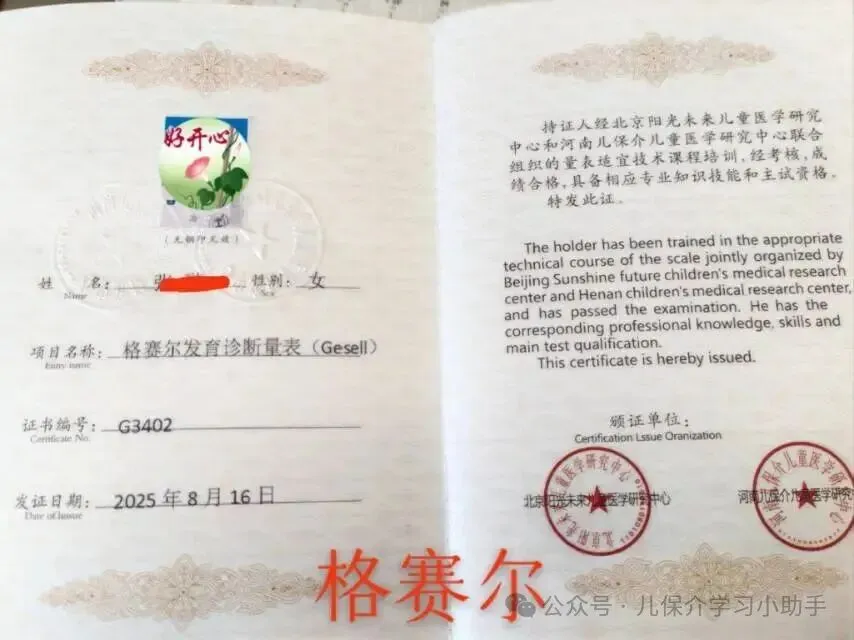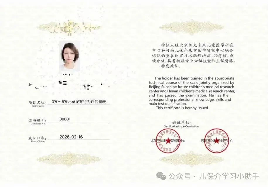 每个月龄组8~10个测查项目,来测查儿童发育行为状况,评估其发育程度,共包含五大能区:大运动能区:指身体的姿势、头的平衡,以及坐、爬、立、走、跑、跳的能力。精细动作能区:指使用手指的能力。语言能区:指理解语言和语言的表达能力。适应能力能区:指儿童对其周围自然环境和社会需要作出反 应和适应的能力。社会行为能区:指对周围人们的交往能力和生活自理能力。本量表主要测量孩子的智力年龄( mental age,MA)和发育商(development quotient;DQ)。智力年龄是反映儿童智力水平高低的指标。发育商是用来衡量儿童心智发展水平的核心指标之一,是在大运动、精细动作、认知、情绪和社会性发 展等方面对儿童发育情况进行衡量。本次培训班特别邀请来自妇幼健康研究会、首都儿科研究所、北京市海淀区妇幼保健院的多名专家参与授课,学习并通过考核后,可获得《资格证书》。
