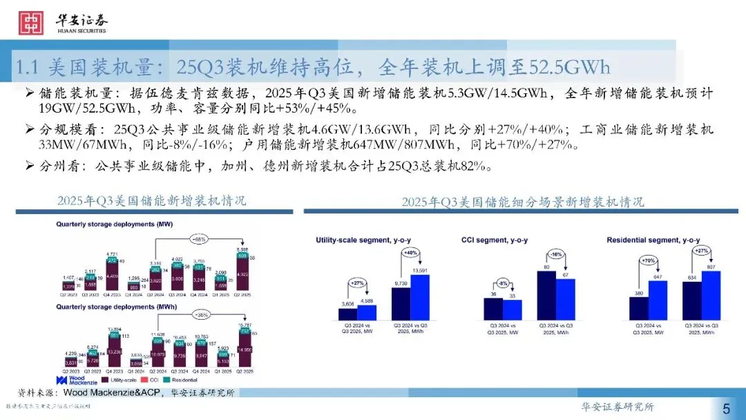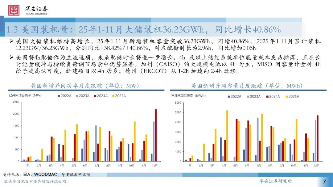 美国储能装机稳步增长,2025年有望实现52.5GWh装机。美国25年1-11月实现增大储装机36.23GWh,除德州加州基本盘外,亚利桑那等新兴州贡献增量。