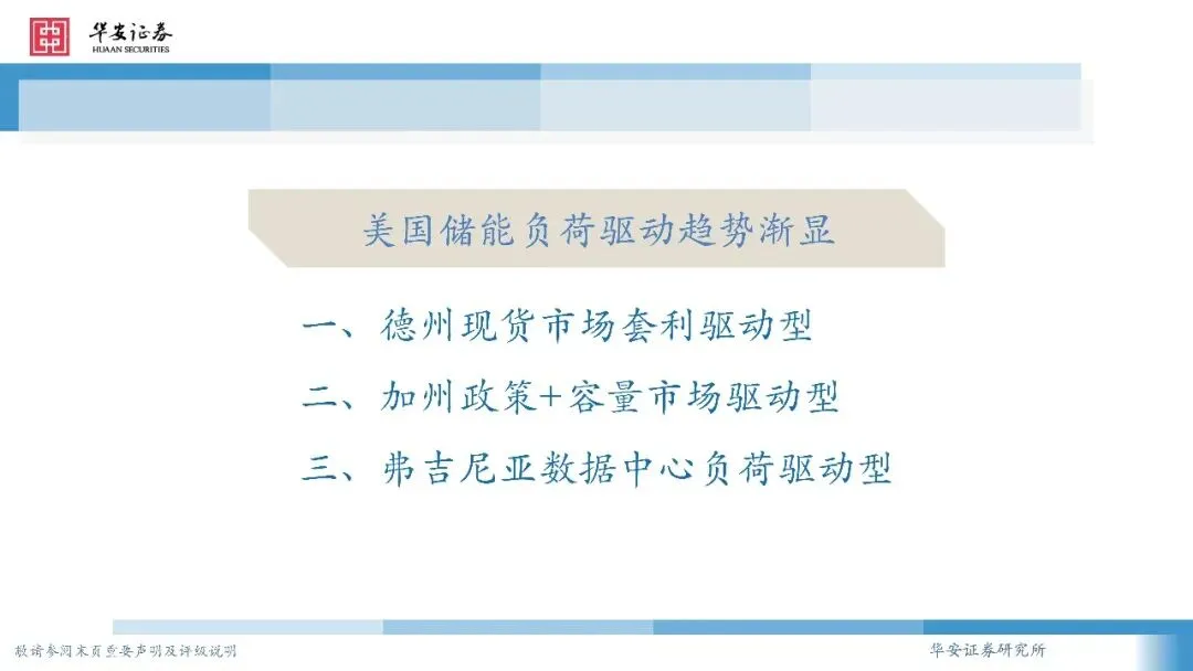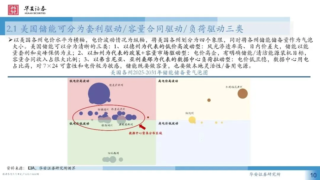 美国储能可分为套利驱动/容量合同驱动/负荷驱动三类。1)以德州为代表的低价高波动型:风光渗透率高、日内价差较大,储能以能量套利和尖峰保供为主;2)以加州为代表的政策+容量市场驱动型:电价高企,有明确储能/清洁能源装机目标,容量合同收入占很大比例;3)以弗吉尼亚、亚利桑那为代表的数据中心负荷拉动型:电价低且稳,数据中心用电占比高,对 7×24 可靠性和电价极为敏感,储能既要做容量,也要做本地灵活性/备用电源。