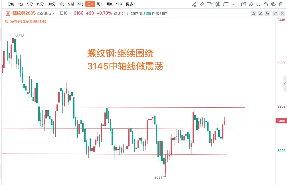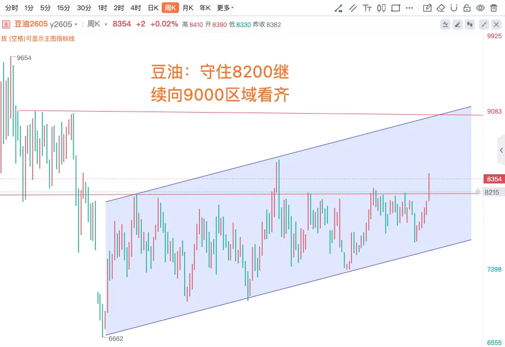 黑色系因为短期的震荡没有持续关注,所以反弹起来就感觉有点突然,但从盘面上看还是有一些信号的,特别是铁矿石780-800的区间震荡走的很标准,焦煤短期走出了个小双底的形态,所以接下来1165的颈线支撑就决定了多头还能不能延续,螺纹企稳在3145之上继续关注3200区域的阻力,玻璃1265之上可以继续尝试反弹布局,纯碱若能企稳1240,那么多头反弹也能延续!油脂板块:棕榈油,豆油,菜油,马棕油: 油脂板块当前处于供需改善 + 政策预期 + 地缘催化三重利多共振期,资金情绪转向积极,外资与机构席位全面做多棕榈油、豆油和菜油,棕榈油因减产去库逻辑最清晰而成为领涨品种,而在美国生物柴油政策利多因素推动下豆油技术面的形态结构则更加明确,守住8200的关键支撑区域,继续向9000区域看齐!所以接下来密切关注美国生物柴油政策落地情况!技术面上马棕油和棕榈油触及到阻力位置需要留意其得失,短期承压会拖累豆菜油的表现,而短期调整回落仍是埋伏的机会!