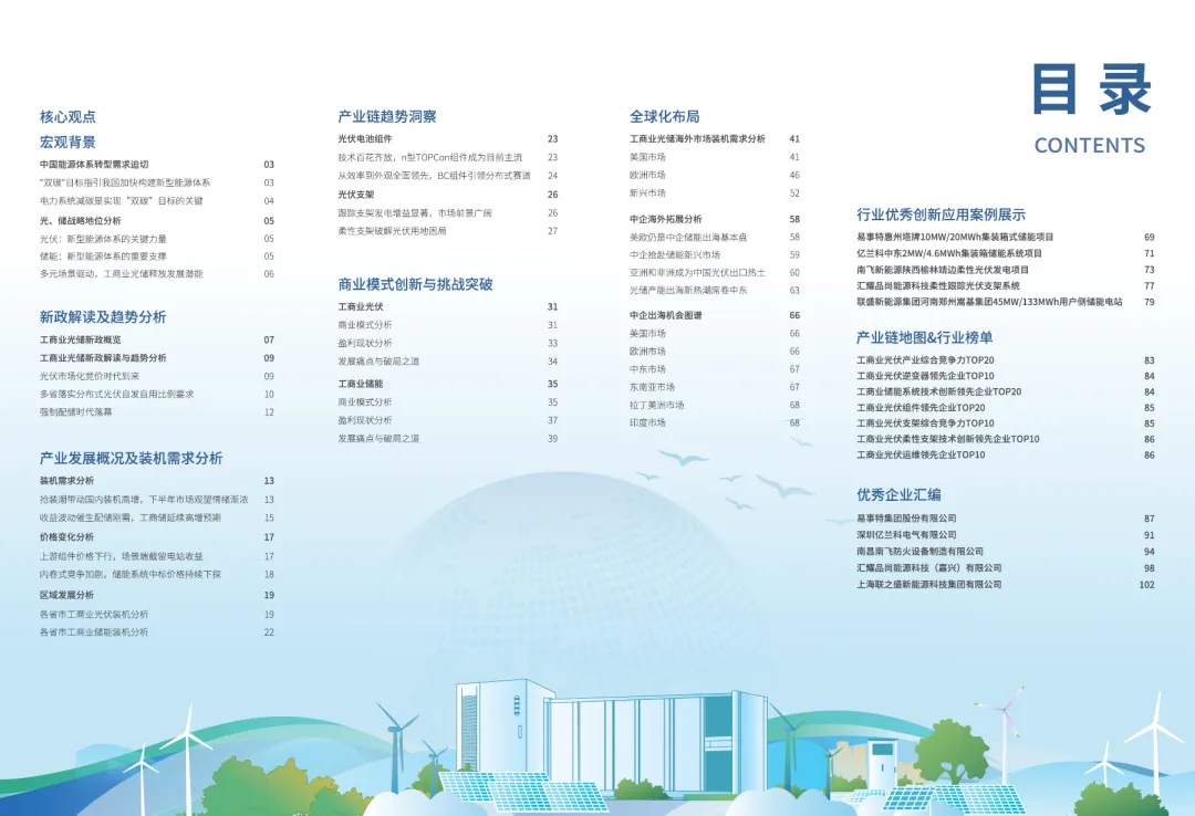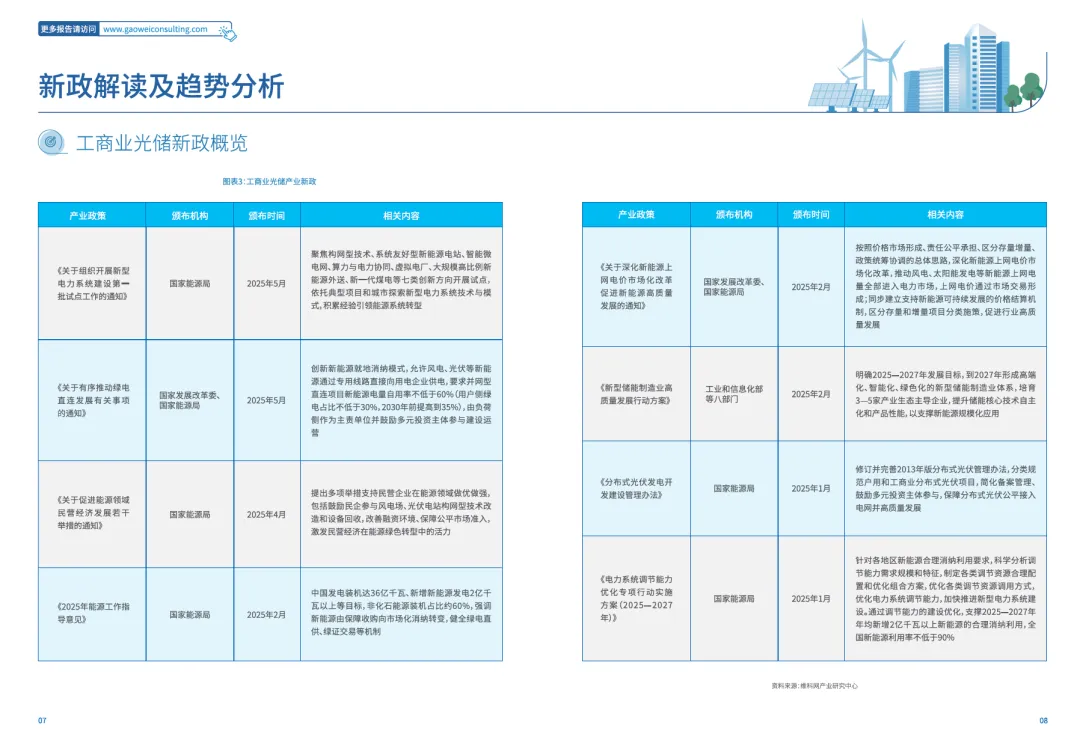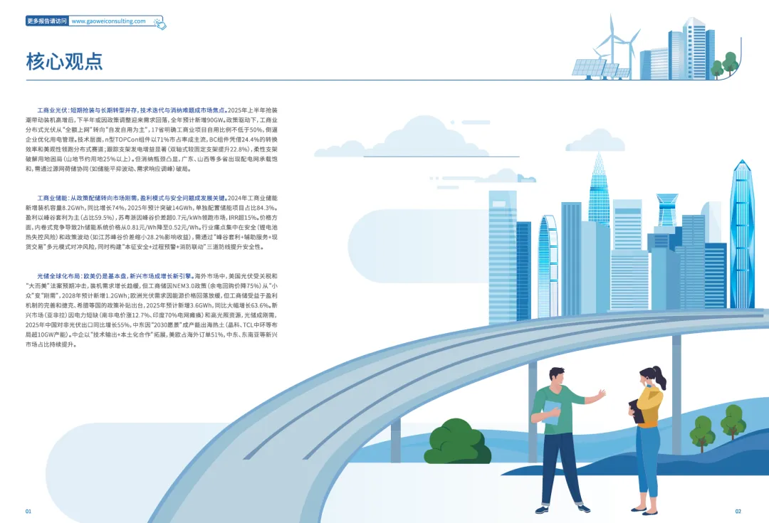 | 工商业光伏:短期抢装与长期转型并存,技术迭代与消纳难题成市场焦点。2025年上半年抢装潮带动装机高增后,下半年或因政策调整迎来需求回落,全年预计新增90GW.政策驱动下,工商业分布式光伏从“全额上网”转向“自发自用为主”,17省明确工商业项目自用比例不低于50%,倒逼企业优化用电管理。技术层面,n型TOPCon组件以71%市占率成主流,BC组件凭借24.4%的转换效率和美观性领跑分布式赛道;跟踪支架发电增益显著(双轴式较固定支架提升22.8%),柔性支架破解用地困局(山地节约用地25%以上)。但消纳瓶颈凸显,广东、山西等多省出现配电网承载饱和,需通过源网荷储协同(如储能平抑波动、需求响应调峰)破局。工商业储能:从政策配储转向市场刚需,盈利模式与安全问题成发展关键。2024年工商业储能新增装机容量8.2GWh,同比增长74%,2025年预计突破14GWh,单独配置储能项目占比84.3%.盈利以峰谷套利为主(占比59.5%),苏粤浙因峰谷价差超0.7元/kWh领跑市场,IRR超15%.价格方面,内卷式竞争导致2h储能系统价格从0.81元/Wh降至0.52元/Wh.行业痛点集中在安全(锂电池热失控风险)和政策波动(如江苏峰谷价差缩小28.2%影响收益),需通过“峰谷套利+辅助服务+现货交易”多元模式对冲风险,同时构建“本征安全+过程预警+消防联动”三道防线提升安全性。光储全球化布局:欧美仍是基本盘,新兴市场成增长新引擎。海外市场中,美国光伏受关税和“大而美”法案预期冲击,装机需求增长趋缓,但工商储因NEM3.0政策(余电回购价降75%)从“小众”变“刚需”,2028年预计新增1.2GWh;欧洲光伏需求因能源价格回落放缓,但工商储受益于盈利机制的完善和捷克、希腊等国的政策补贴出台,2025年预计新增3.6GWh,同比大幅增长63.6%.新兴市场(亚非拉)因电力短缺(南非电价涨12.7%、印度70%电网瘫痪)和高光照资源,光储成刚需,2025年中国对非光伏出口同比增长55%,中东因“2030愿景”成产能出海热土(晶科、TCL中环等布局超10GW产能)。中企以“技术输出+本土化合作”拓展,美欧占海外订单51%,中东、东南亚等新兴市场占比持续提升。 |