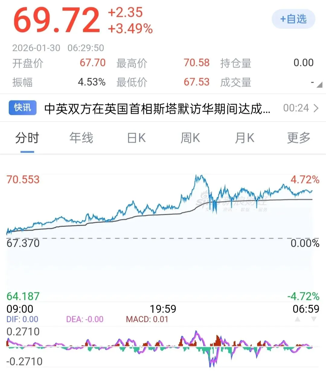 30日凌晨布油维持在69-70美元/桶区间震荡,无明显回调,成交量达73.38万手,持仓量65.65万手,量能配合显示多头信心充足。