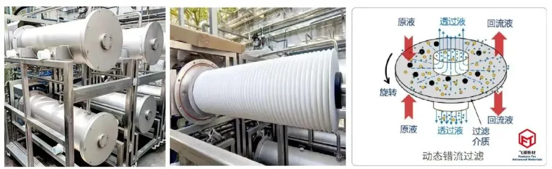 飞潮的纳米级旋转陶瓷膜正是为这一趋势而设计:高通量流道结构为乳清蛋白和牛奶浓缩提供显著的能耗下降空间;抗污染表面处理与剪切强化运行方式降低膜面沉积,让产能更稳定、CIP周期更可控。加上模块化滑架集成设计,能够与现有UF/NF/RO体系无缝拼接,让新产线与技改产线都能用更短停机时间完成落地。飞潮Feature-Tec纳米级旋转动态陶瓷膜Dycera(纳米至微米级孔径选择),通过在膜表面产生高速切向流与膜元件机械旋转形成的强剪切和湍流,应对传统膜分离易发生的浓差极化与污染堆积。