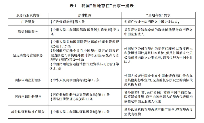 中国在跨境服务贸易的诸多领域有着广泛的“当地存在”要求,在对标CPTPP协定之时,需要认真考虑其去留。如果保留相应的“当地存在”要求,则需要中国在申请加入CPTPP协定之时将之列入负面清单,但这需要取得CPTPP成员国同意中国提交的市场准入报价与不符措施,过多的不符措施清单会导致加入协定的难度增加。基于数字化时代服务贸易发展的特性,适度减少“当地存在”要求应当与列入负面清单并行。除去不纳入本文讨论的电信与金融服务,中国当前明确提出的“当地存在”要求主要体现于广告服务、海运辅助服务、空运销售和营销服务、商标申请注册服务、医药申请注册服务、境外认证机构推广服务等,见表1。