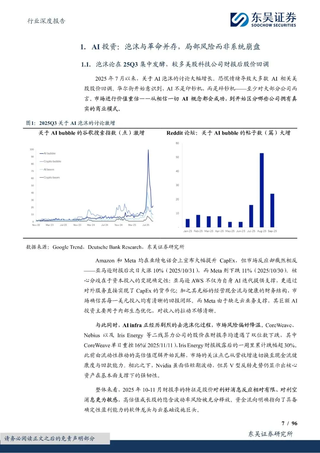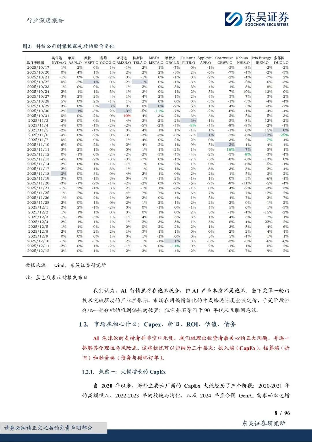 但我们认为,AI 领域仅存在局部泡沫,而非系统性崩盘。AI 基础设施的实际使用生命周期远超市场担忧,推理需求爆发、Agent 模式普及以及多模态应用落地,将为巨额 CapEx 提供更长回报周期支撑。市场的焦虑点集中在 CapEx 规模、折旧争议、循环订单与债务融资,我们逐一做了分析,并认为主要是阶段性情绪波动,而非基本面实质恶化