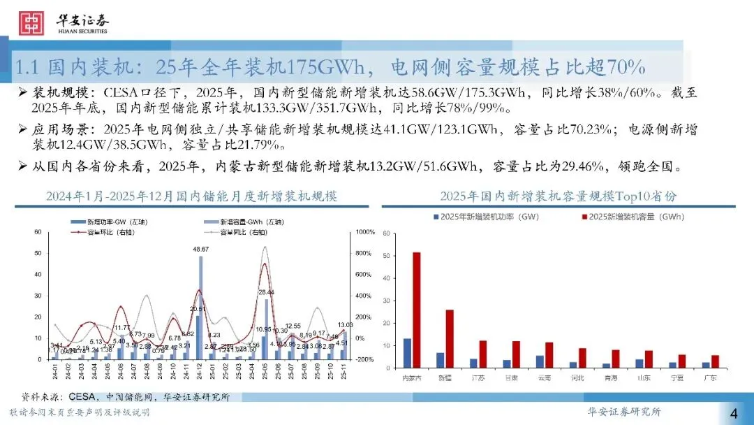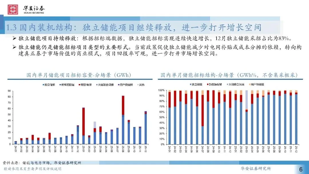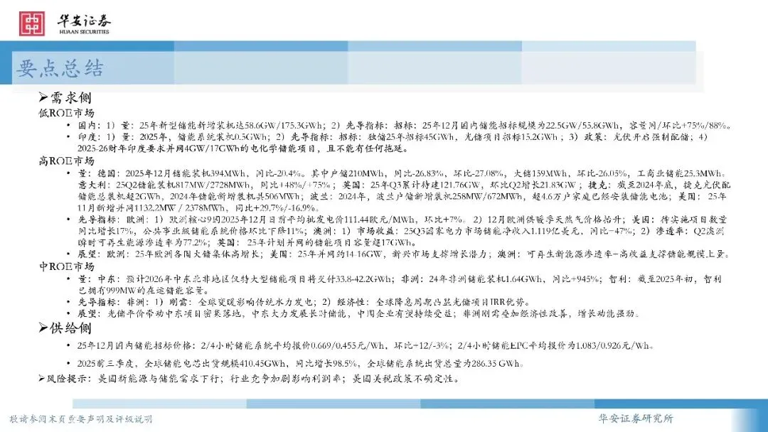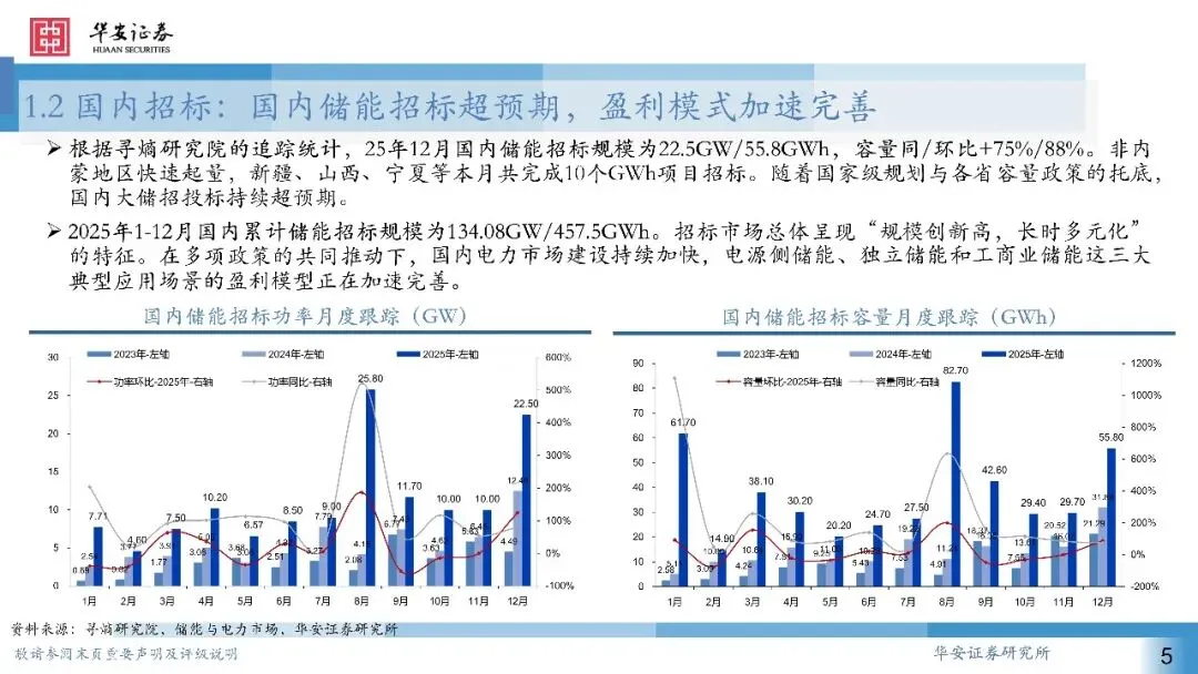 国内:1)量:25年新型储能新增装机达58.6GW/175.3GWh;2)先导指标:招标:25年12月国内储能招标规模为22.5GW/55.8GWh,容量同/环比+75%/88%。